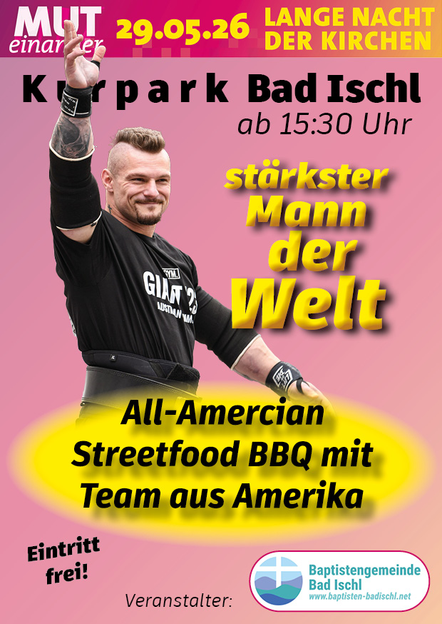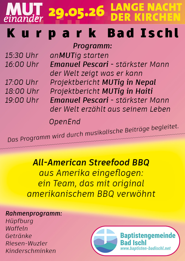 Auch dieses Jahr wird die Veranstaltung im Kurpark in Bad Ischl stattfinden und voller spannender Programmpunkte sein. Der stärkste Mann der Welt wird dabei sein. Wir lassen ein Team aus Amerika einfliegen, das uns mit echtem All-American BBQ verwöhnen wird. MUTmachende Projektberichte aus Haiti und Nepal werden genauso dabei sein, wie eine Hüpfburg, ein Riesen-Wuzler, Waffeln und Musik.